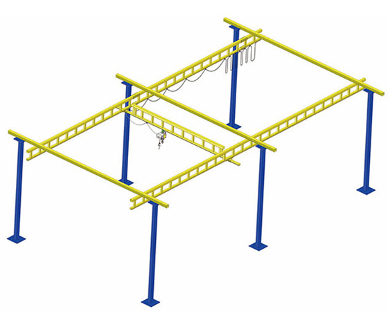 應(yīng)用場(chǎng)景:組合起重設(shè)備,多為支架與剛性/柔性KBK軌道以及工字鋼組合而成,適用范圍更廣。